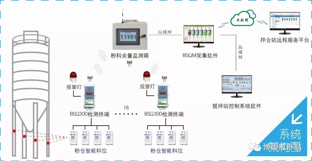 1、每倉安裝一個BSQ300監(jiān)測終端,每站配一個觸摸屏顯示箱,實時顯示物料重量及料位。