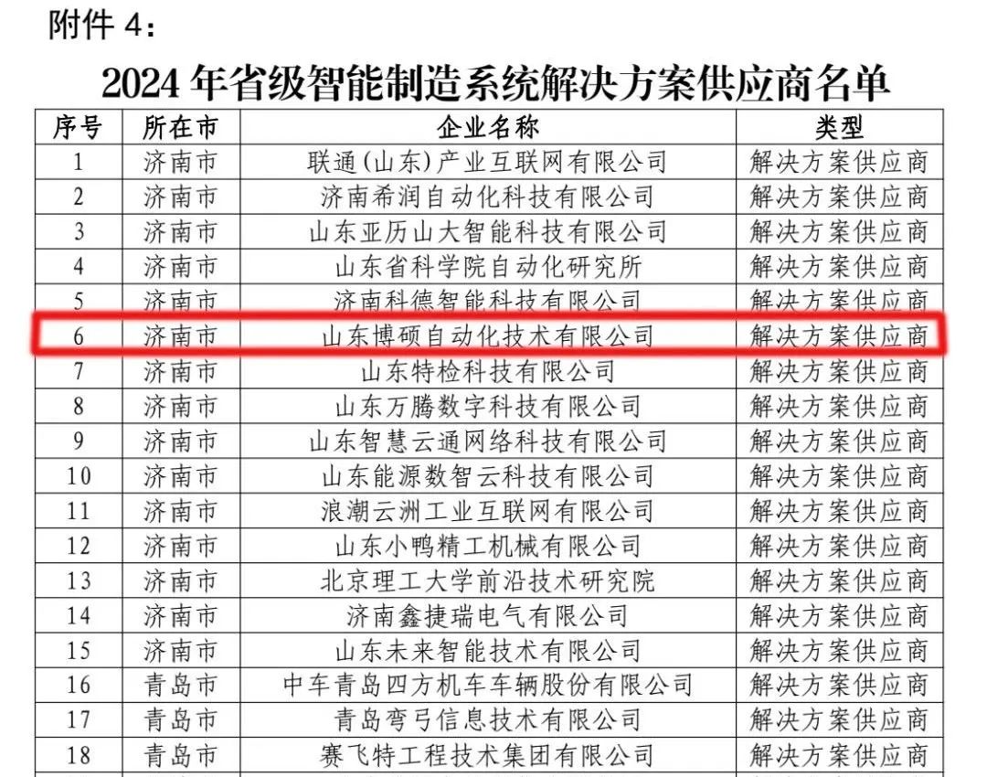 2024年8月,以多項智能化產(chǎn)品為依托,山東博碩成功入選“山東省省級智能制造系統(tǒng)解決方案供應商”名單 。 這是對公司長期以來致力于智能制造領域的技術創(chuàng)新的肯定,也是對其為山東省制造業(yè)升級做出的突出貢獻的認可。